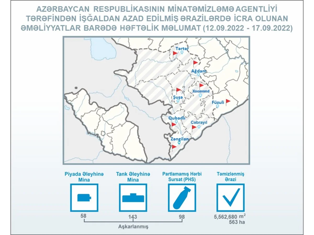 ANAMA-dan "Report"a verilən məlumata görə, sentyabrın 12-dən 17-dək Tərtər, Ağdam, Xocavənd, Füzuli, Şuşa, Qubadlı, Cəbrayıl və Zəngilanda aparılan minatəmizləmə əməliyyatları zamanı piyada əleyhinə 58, tank əleyhinə 143 mina və 98 partlamamış hərbi sursat aşkarlanaraq zərərsizləşdirilib.