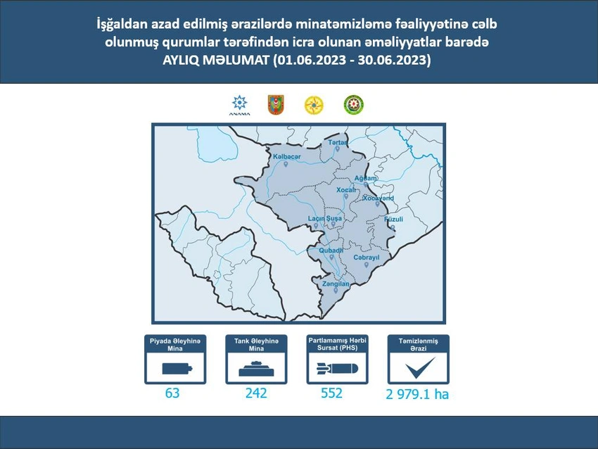 ANAMA-dan "Report"a verilən məlumata görə, iyunun 1-dən iyunun 30-dək Tərtər, Ağdam, Xocavənd, Füzuli, Şuşa, Qubadlı, Cəbrayıl və Zəngilanda aparılan minatəmizləmə əməliyyatları zamanı piyada əleyhinə 63, tank əleyhinə 242 mina və 552 partlamamış hərbi sursat aşkarlanaraq zərərsizləşdirilib.