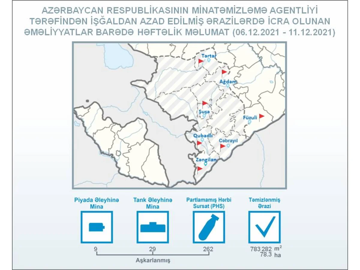 ANAMA-dan "Report"a verilən məlumata görə, dekabrın 6-dan 11-dək Tərtər, Ağdam, Füzuli, Şuşa, Qubadlı, Cəbrayıl və Zəngilanda aparılan minatəmizləmə əməliyyatları zamanı piyada əleyhinə 9, tank əleyhinə 29 mina və 262 partlamamış hərbi sursat aşkarlanaraq zərərsizləşdirilib.