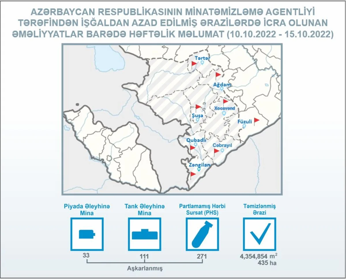 ANAMA-dan "Report"a verilən məlumata görə, oktyabrın 10-dan 15-dək Tərtər, Ağdam, Xocavənd, Füzuli, Şuşa, Qubadlı, Cəbrayıl və Zəngilanda aparılan minatəmizləmə əməliyyatları zamanı piyada əleyhinə 33, tank əleyhinə 111 mina və 271 partlamamış hərbi sursat aşkarlanaraq zərərsizləşdirilib.