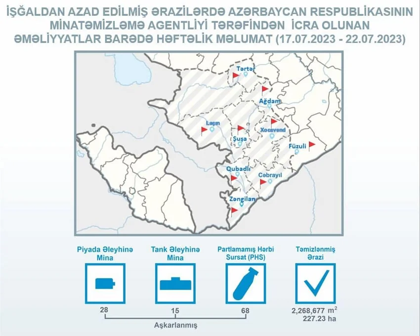 ANAMA-dan "Report"a verilən məlumata görə, iyulun 17-dən iyulun 22-dək Tərtər, Ağdam, Xocavənd, Füzuli, Şuşa, Qubadlı, Cəbrayıl və Zəngilanda aparılan minatəmizləmə əməliyyatları zamanı piyada əleyhinə 28, tank əleyhinə 15 mina və 68 partlamamış hərbi sursat aşkarlanaraq zərərsizləşdirilib.