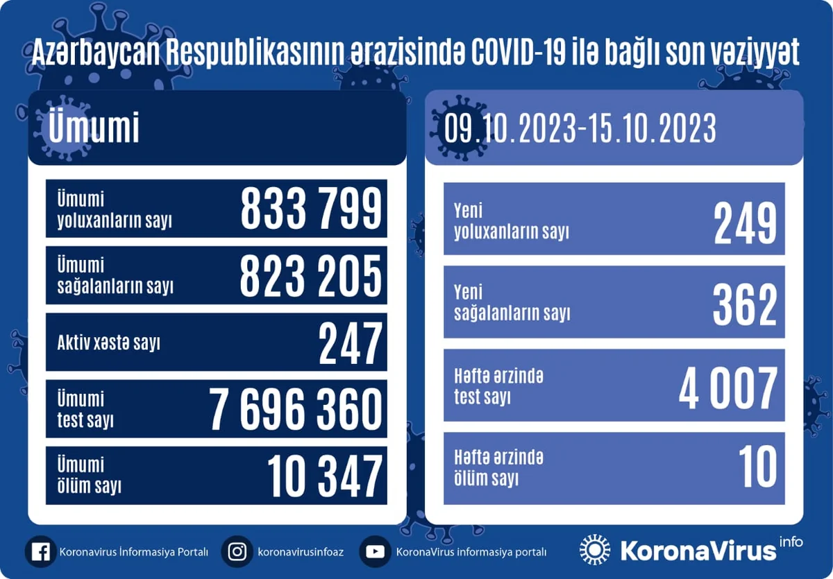 Azərbaycanda son 1 həftə ərzində (09-15 oktyabr) koronavirus (COVID-19) infeksiyasına yoluxanların və peyvənd olunanların sayı açıqlanıb.