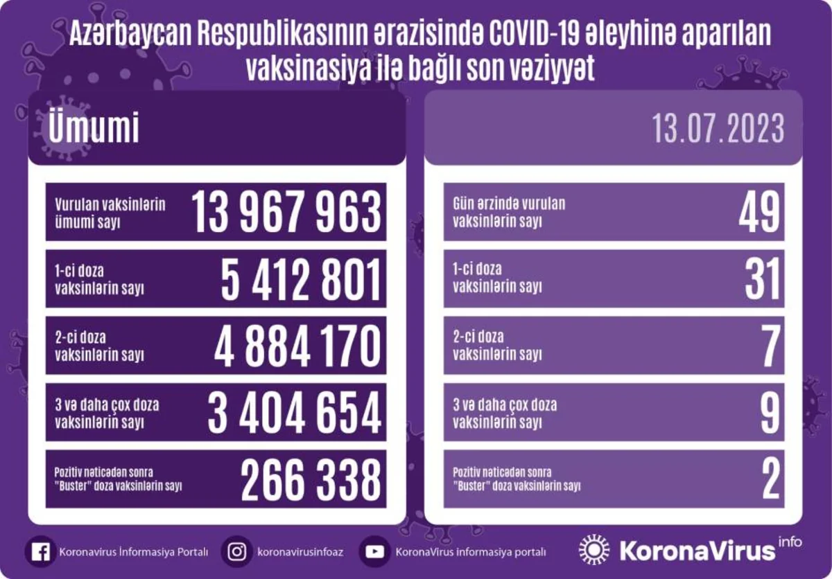 Azərbaycanda bu günə qədər vurulan vaksinlərin ümumi sayı isə 13 967 963 olub.