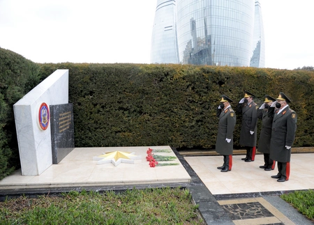 Sonra Şəhidlər xiyabanında ölkəmizin müstəqilliyi və ərazi bütövlüyü uğrunda canlarından keçən Vətən övladlarının unudulmaz xatirəsinə ucaldılan “Əbədi məşəl” önünə əklil qoyulub, Daxili Qoşunların şəhid olan hərbi qulluqçularının abidəsi ziyarət olunub.