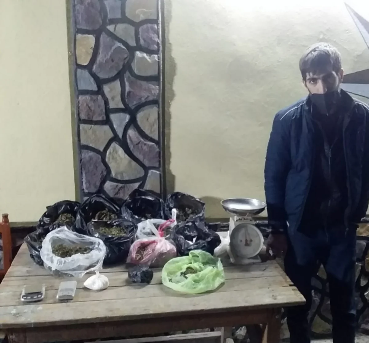 Şəxsi axtarış zamanı ondan 1 kiloqramdan artıq heroin, 495 qram metamfetamin və 1 ədəd elektron tərəzi aşkar edilərək götürülüb.