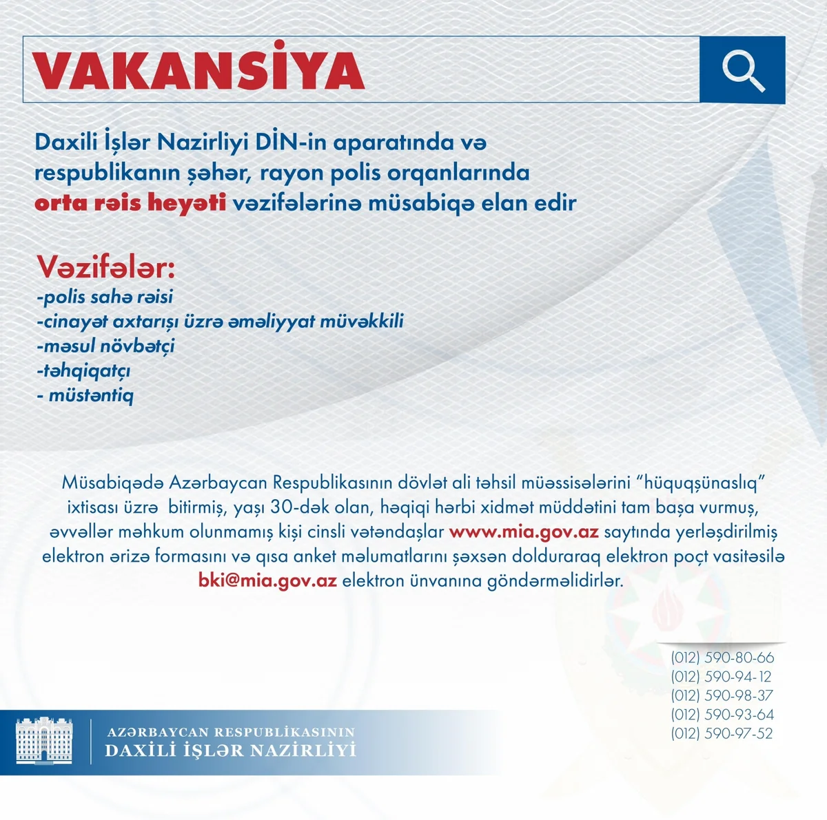 Daxili İşlər Nazirliyin aparatında və respublikanın şəhər, rayon polis orqanlarında ali hüquq təhsili tələb olunan vəzifələrdə (polis sahə rəisi, cinayət axtarışı üzrə əməliyyat müvəkkili, məsul növbətçi, təhqiqatçı və müstəntiq) xidmətə qəbulla əlaqədar müsabiqə keçirilir.