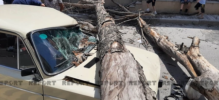 Gəncədə küləkli hava şəraiti nəticəsində iri gövdəli ağac avtomobilin üzərinə aşıb.