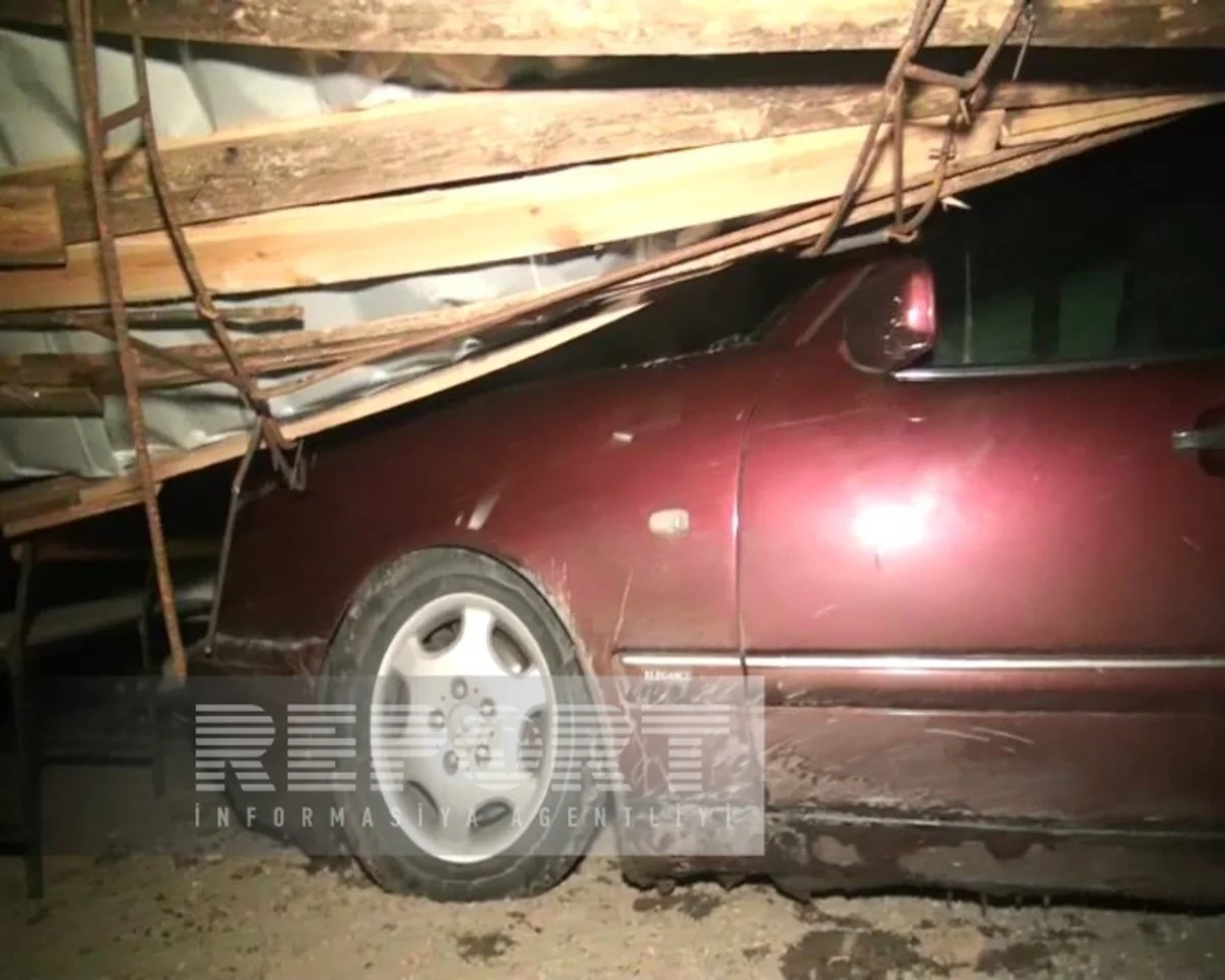 Çardağın dağıntıları altında qalan “Mercedes” markalı minik avtomobili yararsız hala düşüb.
