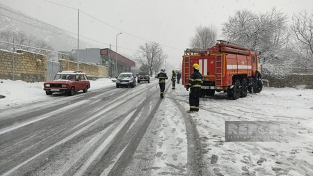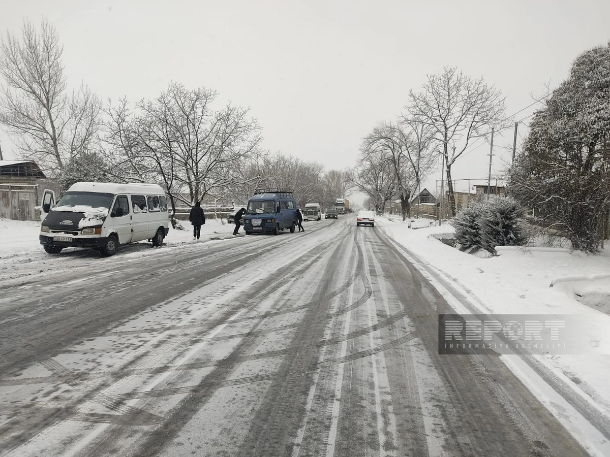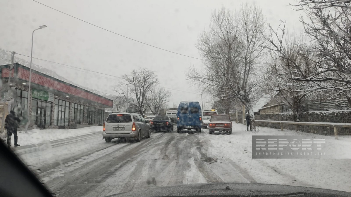 Şəkidə qar yolları iflic edib, avtomobillər yolda qalıb.