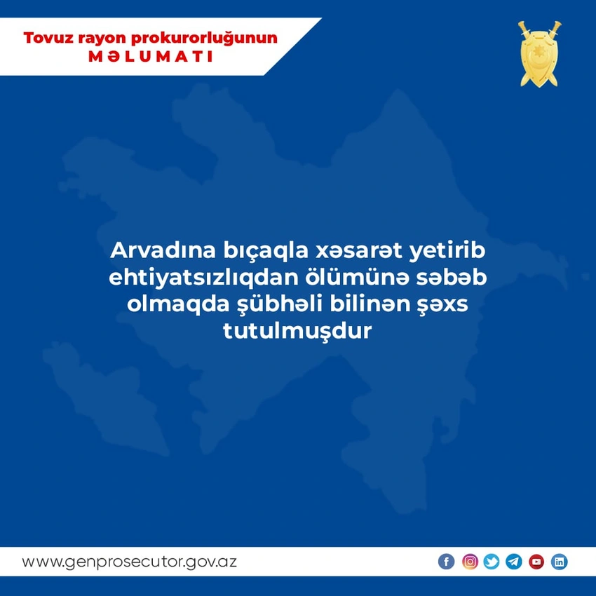Faktla bağlı Tovuz rayon prokurorluğunda Cinayət Məcəlləsinin 126.3-cü (qəsdən sağlamlığa ağır zərər vurma ehtiyatsızlıqdan zərərçəkmiş şəxsin ölümünə səbəb olduqda) maddəsi ilə cinayət işi başlanıb.