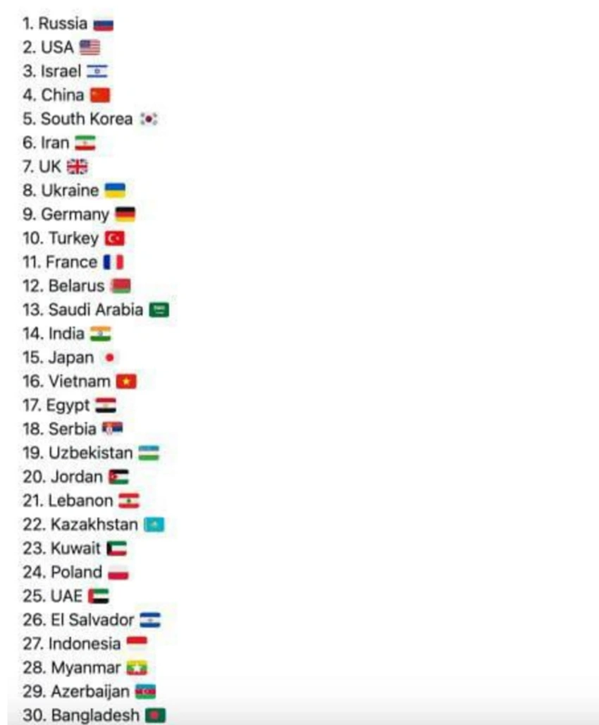 Siyahıda ilk sıralarda Rusiya, ABŞ, İsrail, Çin, Böyük Britaniya, Almaniya, Türkiyə, Ukrayna orduları yer alıb.
