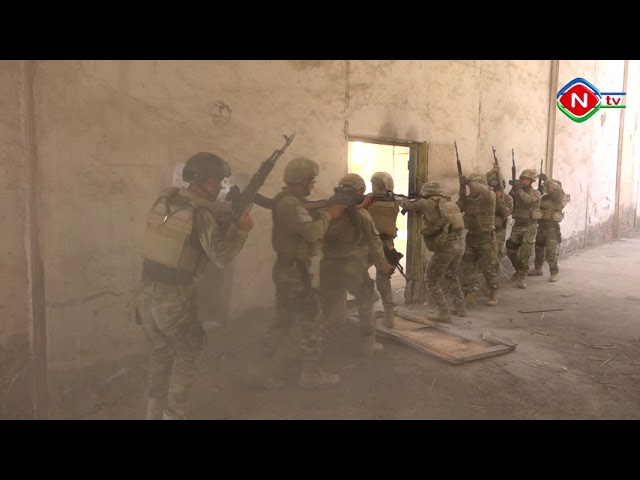 Xüsusi təyinatlılarımız şərti düşmənin təxribat-diversiya qrupunu zərərsizləşdirmək üçün antiterror əməliyyatları zamanı binalarda tətbiq edilən yaxın məsafədə döyüş elementlərini yerinə yetirirlər.