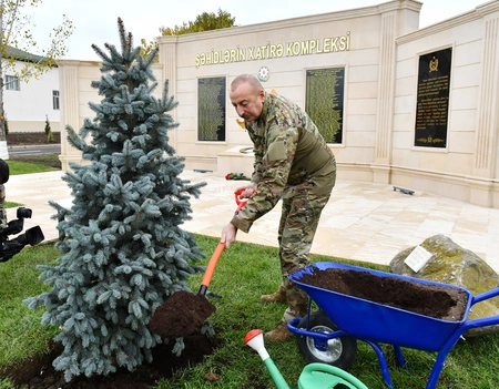 Prezident İlham Əliyev hərbi şəhərciyin ərazisində şəhidlərin xatirəsinə ucaldılmış abidə kompleksinin önünə gül dəstəsi qoyub, burada ağac əkib.