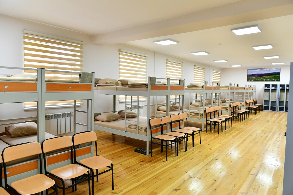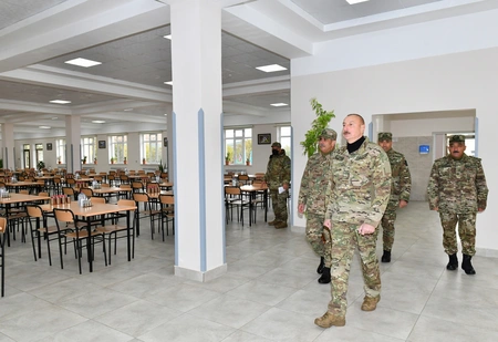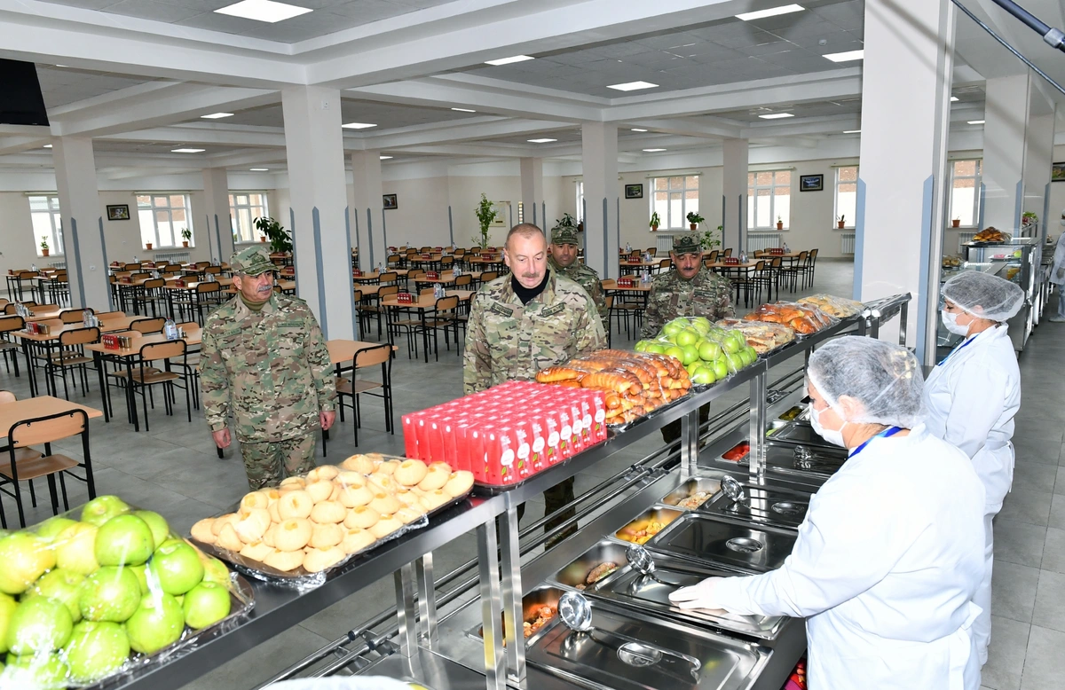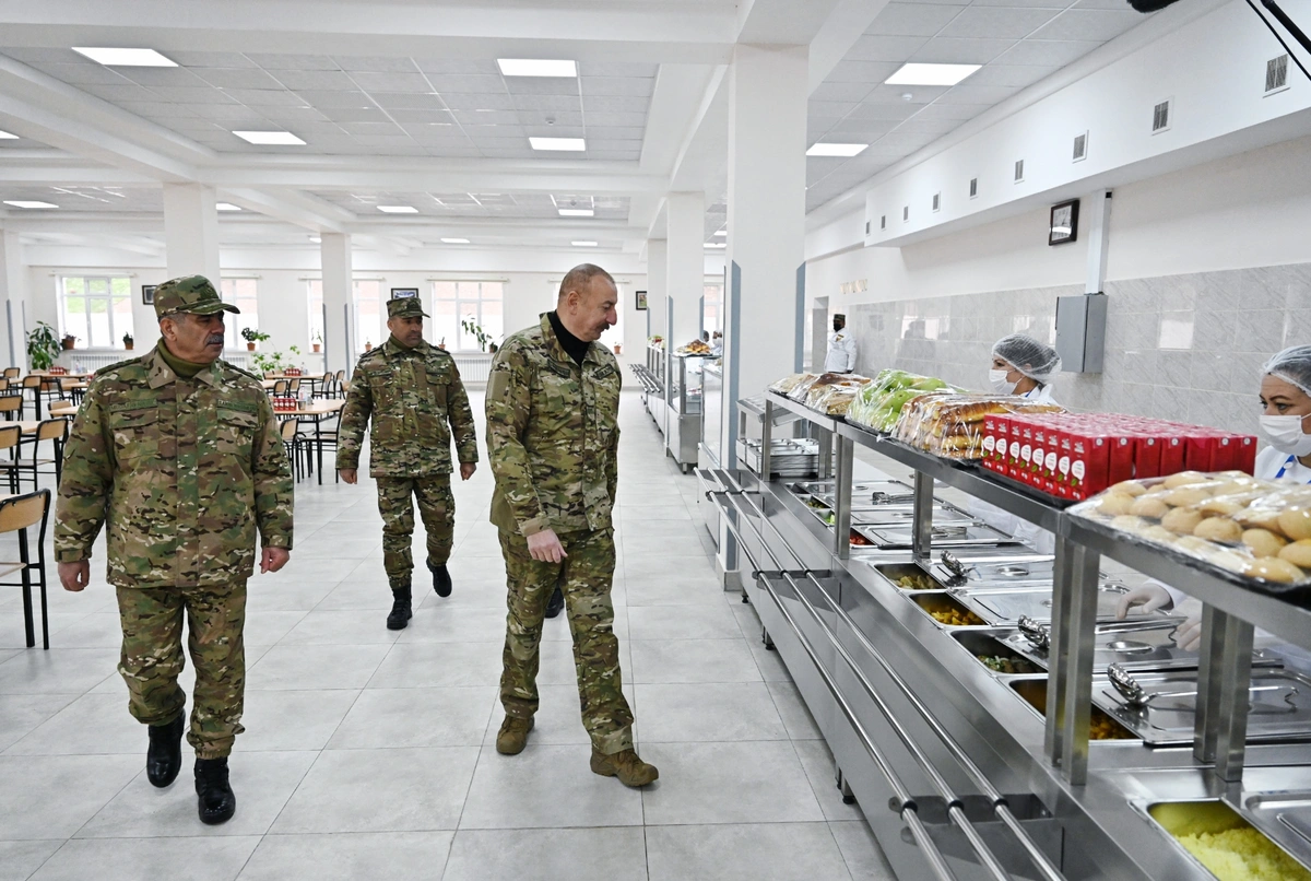Prezident, Müzəffər Ali Baş Komandan İlham Əliyev hərbi şəhərcikdə əsgər yataqxanası, əsgər yeməkxanası və idman zalı ilə tanış olub.