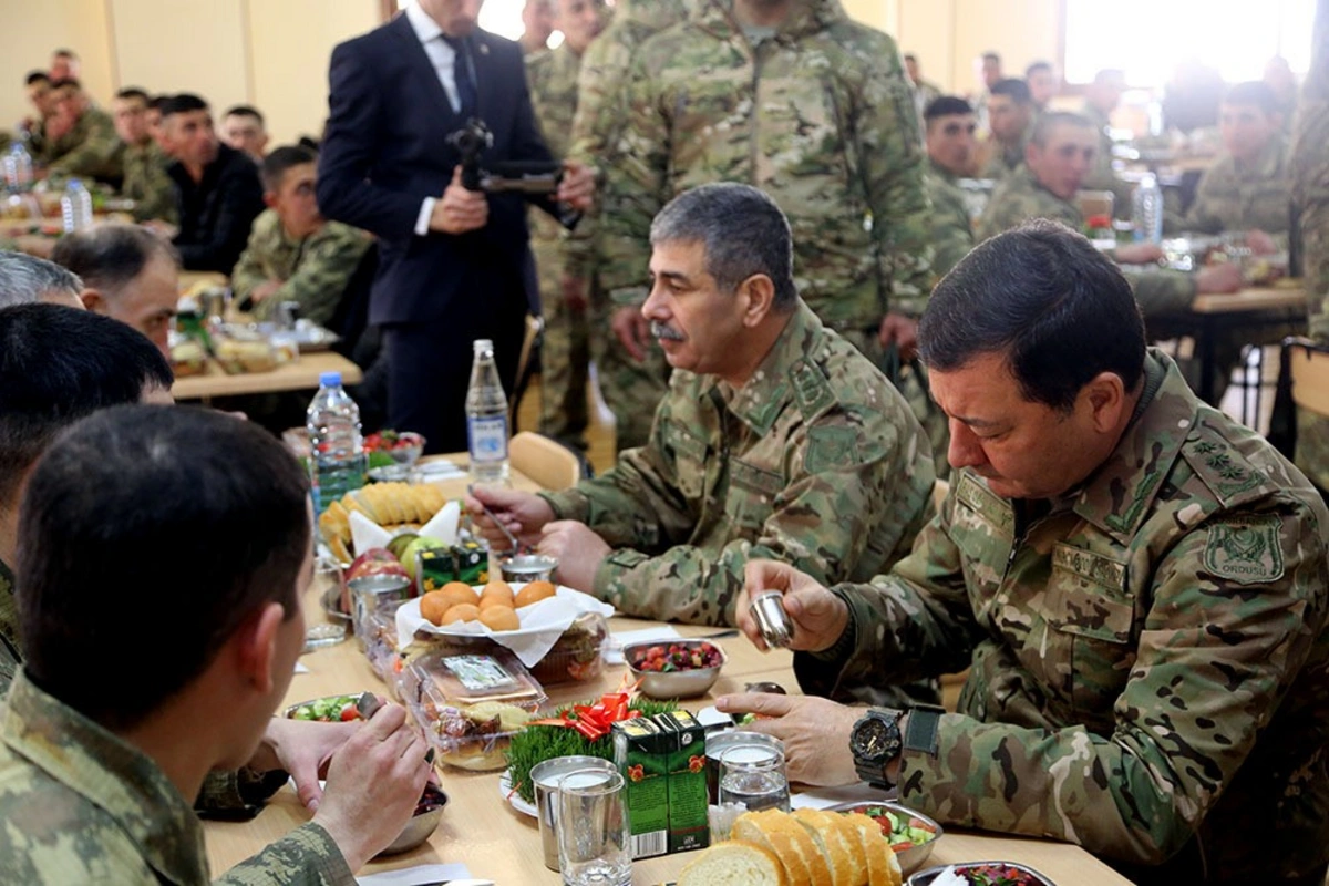 Şəxsi heyət üçün təşkil olunan bayram konsertindən sonra Müdafiə naziri hərbi qulluqçular və ziyarətçilərlə birlikdə bayram süfrəsi arxasında nahar ediblər.