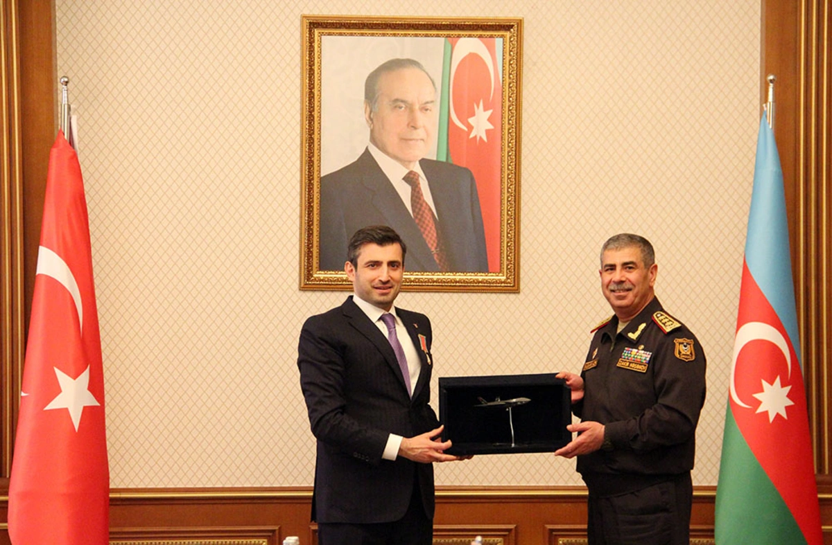 Müdafiə naziri general-polkovnik Zakir Həsənov ölkəmizdə səfərdə olan Türkiyənin “Baykar” şirkətinin texniki direktoru Selçuk Bayraktar ilə görüşüb, onu "Hərbi əməkdaşlıq sahəsində xidmətlərə görə" medalı ilə təltif edib.