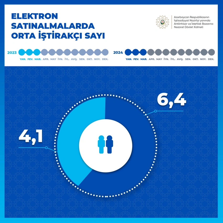 Bu ilin yanvar-mart aylarında Azərbaycanda elektron satınalmalarda orta iştirakçı sayı 2023-cü ilin müvafiq dövrü ilə müqayisədə 56 % artaraq 6,4 təşkil edib.