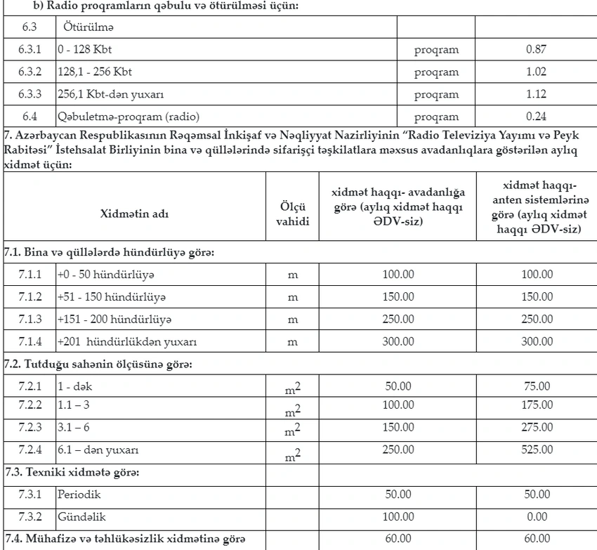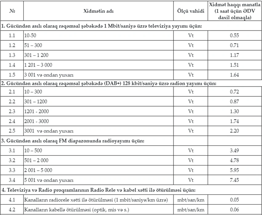Qərara əsasən, yerüstü yayımın təmin olunması və siqnalın ötürülməsi ilə əlaqədar xidmət haqlarının məbləği aşağıdakı kimidir: