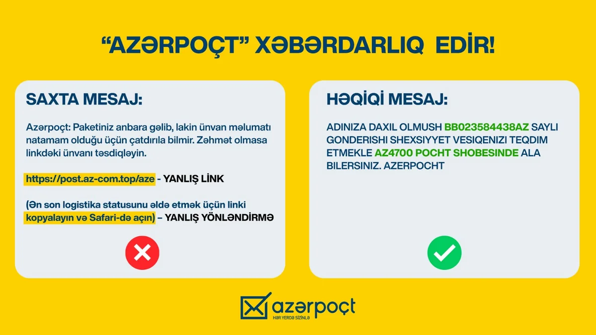Məlumata görə, son zamanlar vətəndaşlara “Azərpoçt”un adından kütləvi şəkildə saxta mesajlar göndərilir, həmin mesajlarda vətəndaşların bağlamasının ölkəyə daxil olduğu, amma guya ev ünvanının natamamlığı səbəbindən mənzilə çatdırılmadığı qeyd olunur və elə həmin mesajda da saxta link göndərilir ki, ünvan və digər fərdi məlumatlar daxil edilsin.