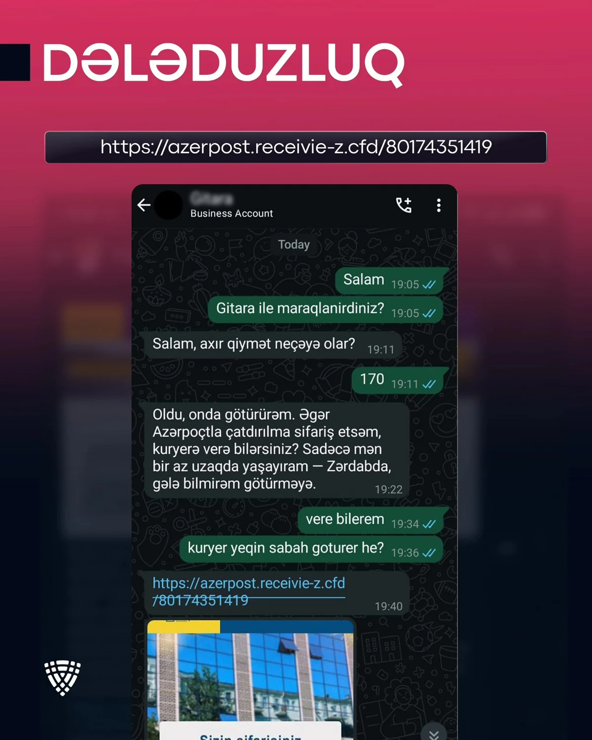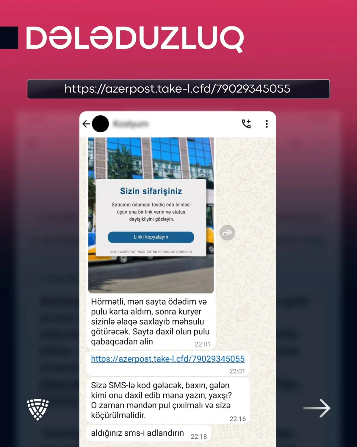 Elan platformalarında məhsul yerləşdirən vətəndaşlara müxtəlif nömrələr vasitəsilə Azərbaycan Nəqliyyat və Kommunikasiya Holdinqinin (AZCON) tərkibində fəaliyyət göstərən “Azərpoçt” MMC adından saxta mesajlar göndərilir və məhsulu almaq istəyi bildirilir.