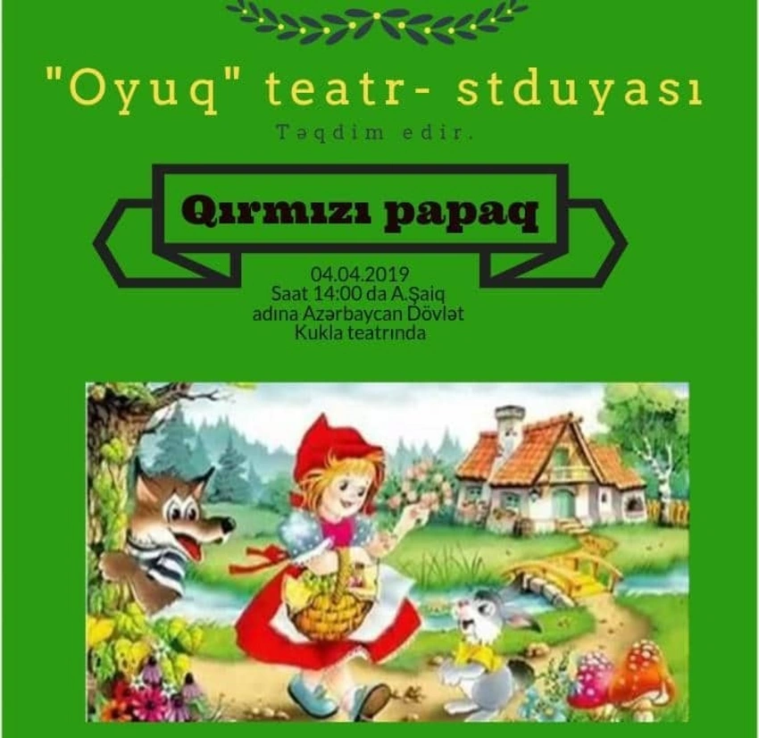 Həmin gün “Oyuq”çular balaca tamaşaçıları qarşısında “Qırmızıpapaq” tamaşası ilə çıxış edəcəklər.