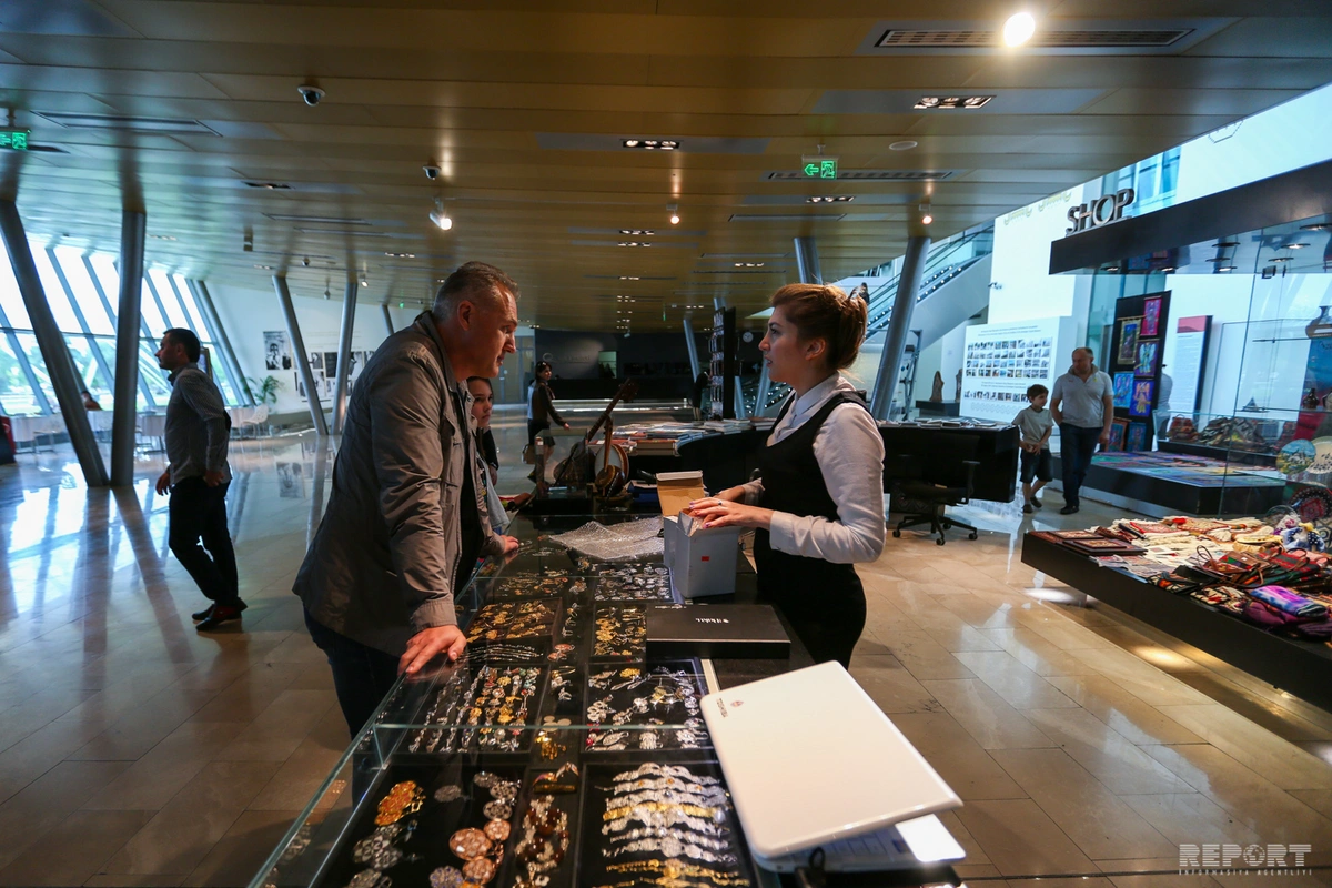 Binaya daxil olarkən bizi bələdçimiz, Xalça Muzeyinin mətbuat katibi Sadiqə Abdullayeva qarşıladı. Foyenin böyük bir hissəsində satışda olan suvenirlər, xalçalar və zinət əşyaları yerləşir. Digər hissəsində isə kiçik kafe xidmət göstərir. Kafedə qiymətlər 1-5 AZN aralığındadır. Muzeyə çanta və ya üst geyimlə daxil olmaq qadağandır. Bunun üçün də girişdə xüsusi şkaflar və qarderob yerləşir.