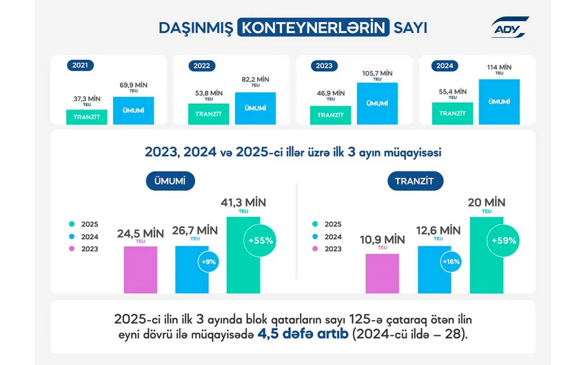 Bu ilin I rübündə "Azərbaycan Dəmir Yolları" QSC (ADY) 41,3 min TEU konteyner yük, o cümlədən 20 min TEU konteyner tranzit yükü daşıyıb.