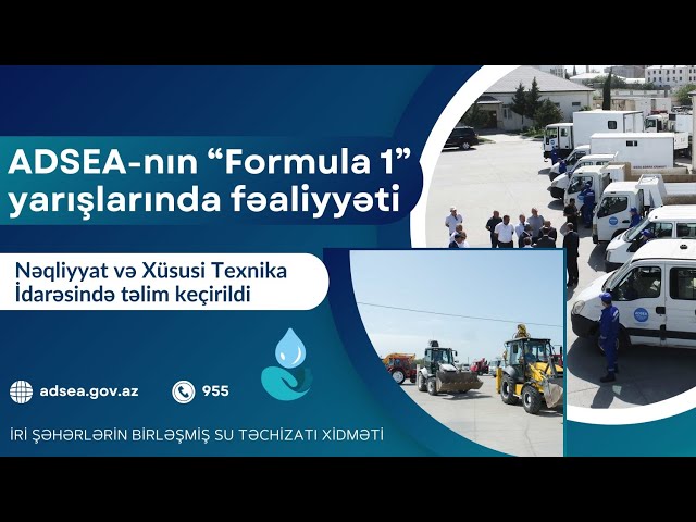 Bildirilib ki, 13-15 sentyabr tarixlərində Bakıda keçiriləcək "Formula 1" yarışları ilə əlaqədar ADSEA-nın İri Şəhərlərin Birləşmiş Su Təchizatı Xidməti təlimləri plana uyğun olaraq davam etdirir. Nəqliyyat və Xüsusi Texnika İdarəsinin 2 saylı qarajında təşkil olunan növbəti tədbirdə xüsusi texnika və nəqliyyat vasitələrinə baxış keçirilib. Tədbirdə İri Şəhərlərin Birləşmiş Su Təchizatı Xidmətinin İdarə Heyətinin sədri Köçərli Həsənov, sədr müavini Tahir Xəlilov, Nəqliyyat və Xüsusi Texnika İdarəsinin rəisi Samir Cəbrayılov və əməkdaşlar iştirak ediblər.