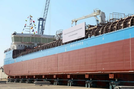 Məlumata görə, bu məqsədlə gəmi zavodun tikinti-quraşdırma sahəsindən üzən dok üzərindən hidravlik arabacıqlar vasitəsilə suya salınıb.