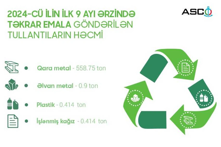 Bu ilin yanvar-sentyabr aylarında "Azərbaycan Xəzər Dəniz Gəmiçiliyi" QSC (ASCO) 0,414 ton kağızı, 0,414 ton plastması, 558,75 ton qara metalı və 0,9 ton əlvan metalı təkrar emala göndərib.