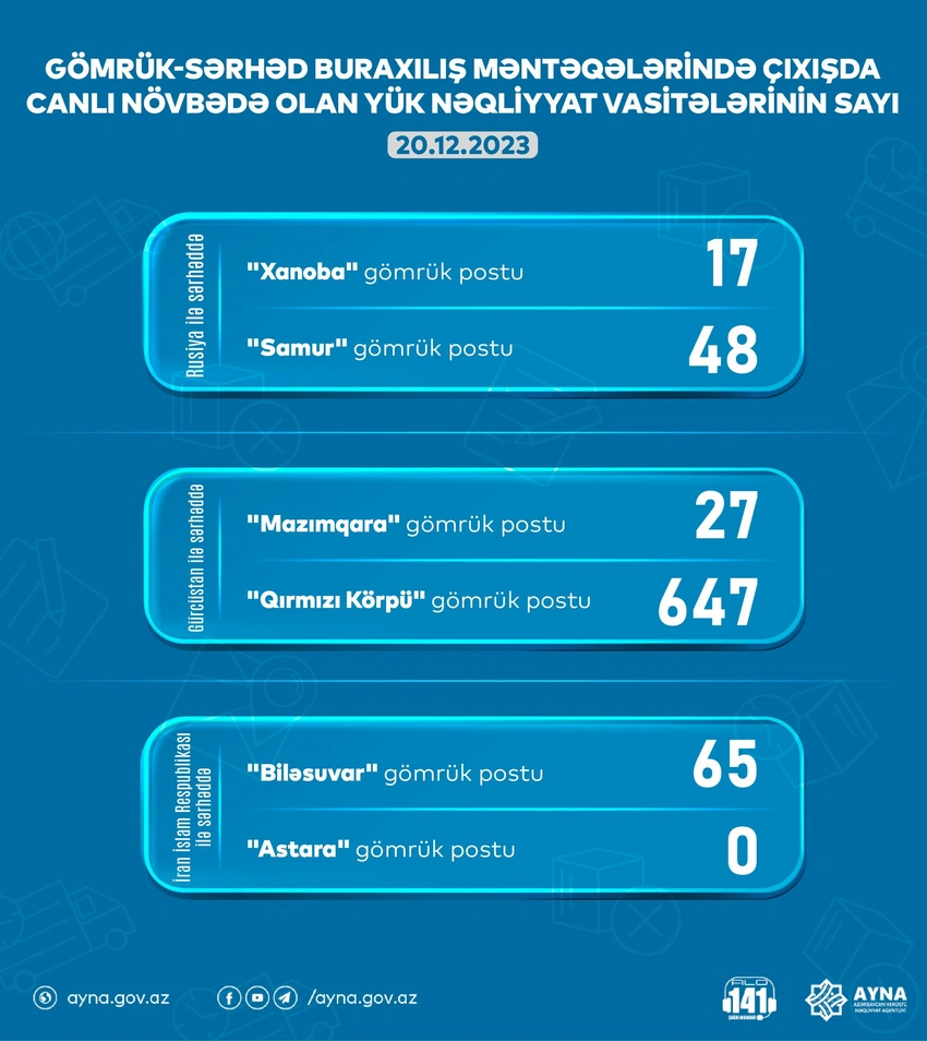 Gömrük-sərhəd məntəqələrində çıxışda gözləmədə olan nəqliyyat vasitələrinin sayı barədə məlumata əsasən, “Biləsuvar” gömrük postunda 65, “Mazımqara” gömrük postunda 27, “Samur” gömrük postunda 48, “Xanoba” gömrük postunda 17 yük maşını var. “Astara” gömrük postunda isə maşın yoxdur.