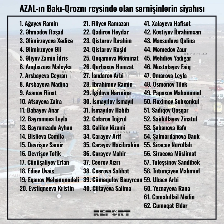 AZAL Aktauda qəzaya uğrayan təyyarədə olan sərnişinlərin və ekipaj üzvlərinin siyahısını açıqlayıb