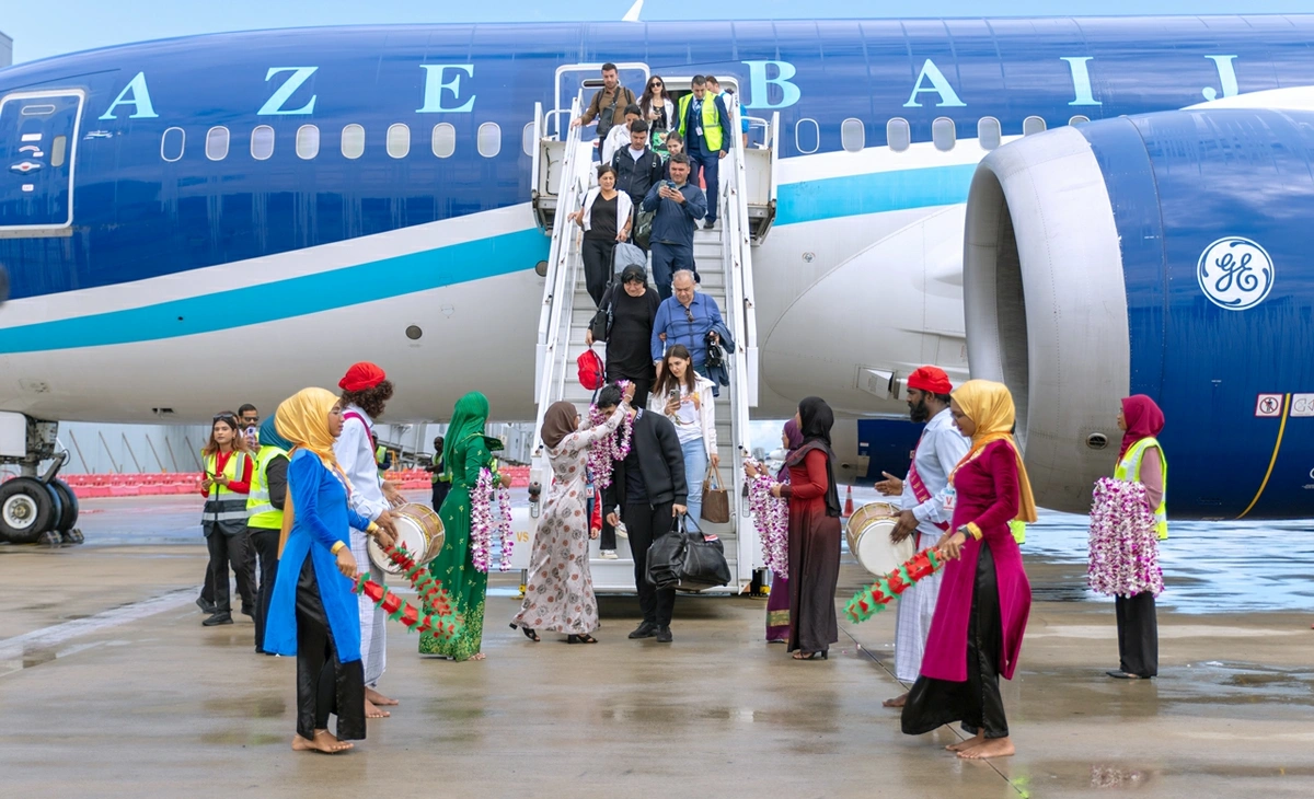 Sərnişinlər və uçuş heyəti hava limanında qonaqpərvərlik və dostluq rəmzi olan ənənəvi çələnglərlə səmimi qarşılanıblar.