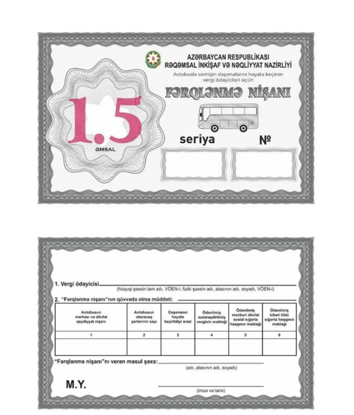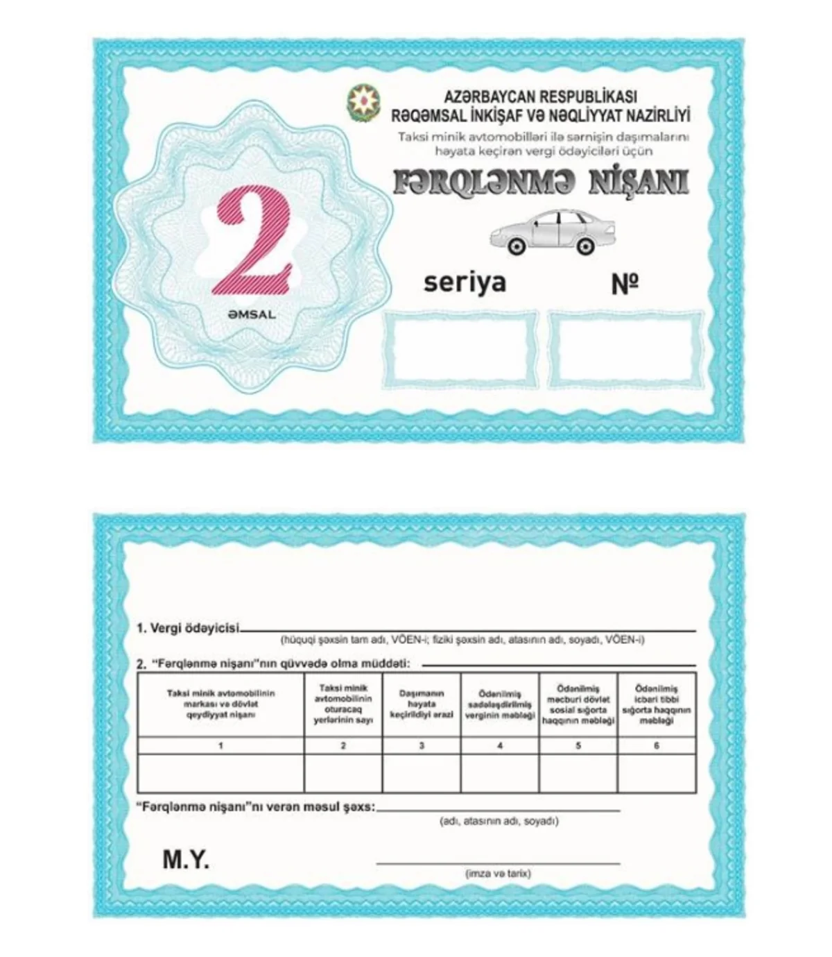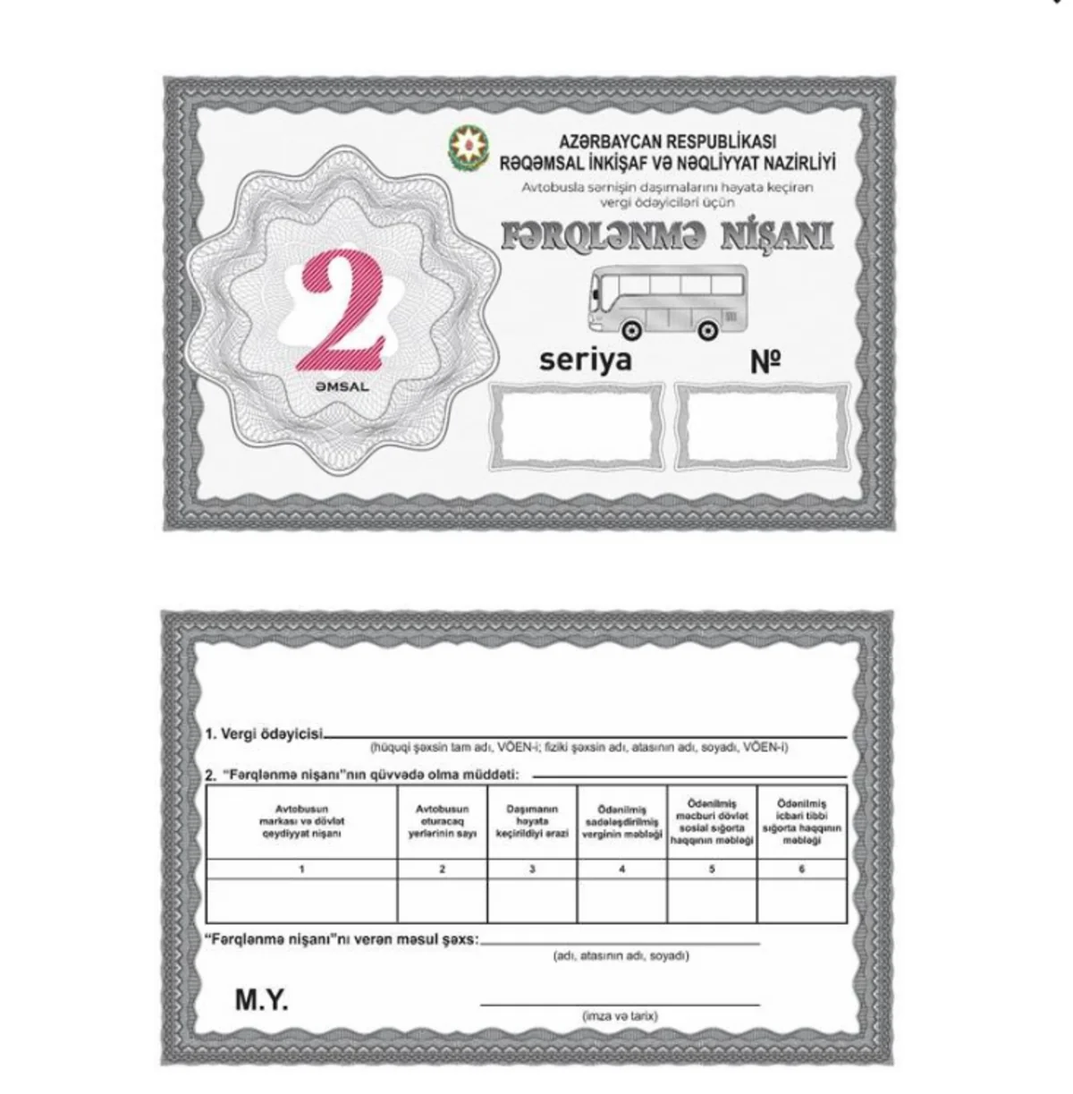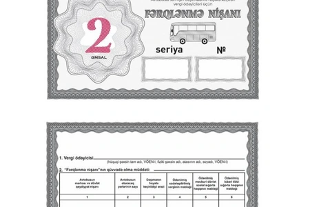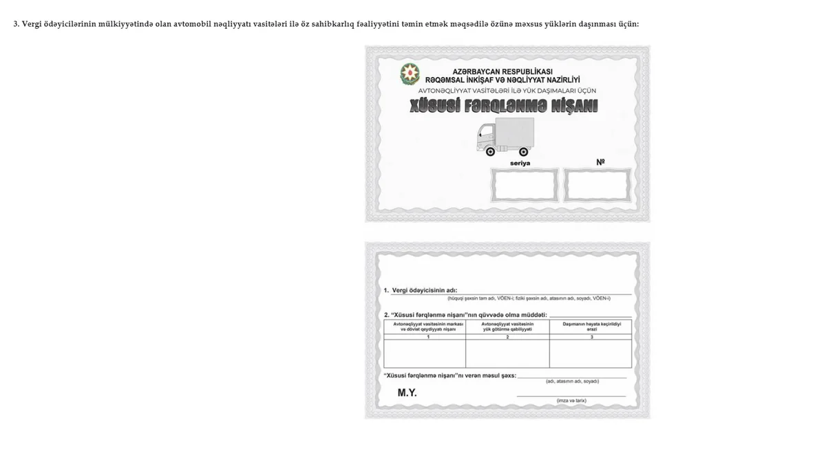 Həmçinin vergi ödəyicilərinin mülkiyyətində olan avtobuslar və minik avtomobilləri ilə öz sahibkarlıq fəaliyyətini təmin etmək məqsədilə işçilərin, eləcə də avtomobil nəqliyyatı vasitələri ilə öz sahibkarlıq fəaliyyətini təmin etmək məqsədilə özünə məxsus yüklərin daşınması üçün “Xüsusi fərqlənmə nişanı”nın forması təsdiqlənib.