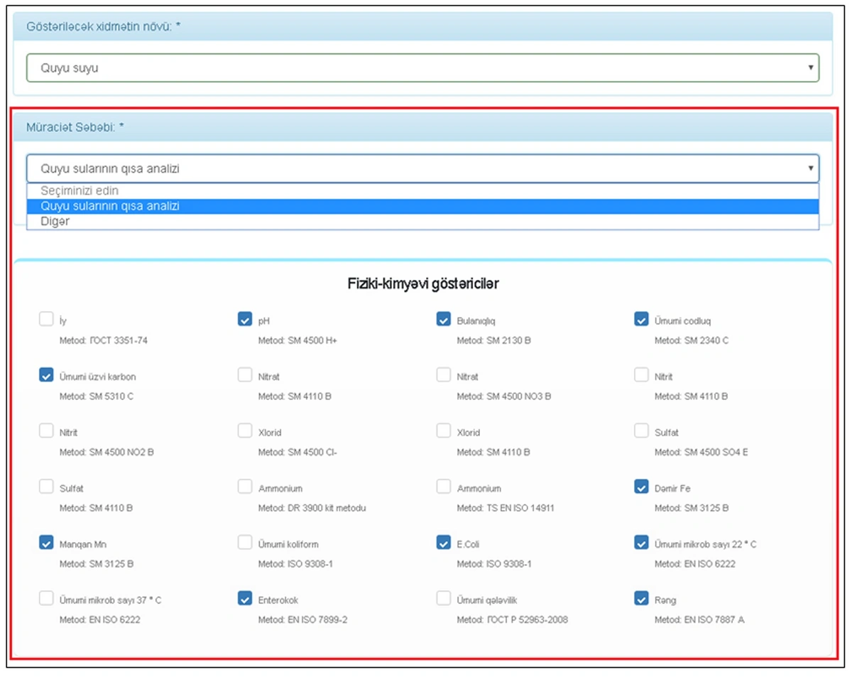 Bunun üçün www.e-gov.az portalında qeydiyyatdan keçmiş vətəndaşlar portalın xidmətlər bölməsində “Azərsu” ASC, daha sonra “Su nümunələrinin yoxlanılmasına dair müraciət” adlı elektron xidməti seçməlidir.