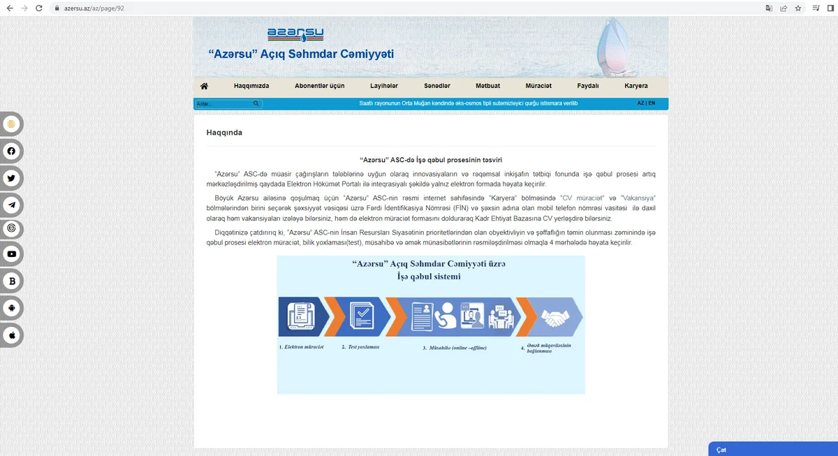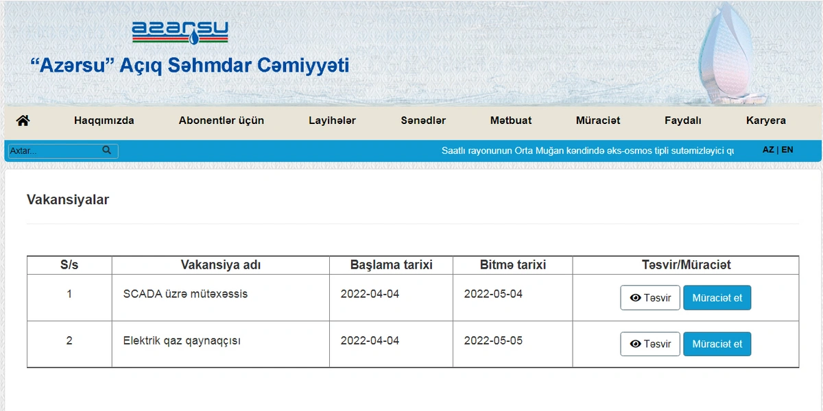 “Azərsu” ASC işə qəbul üçün müraciətləri elektron qaydada qəbul etməyə başlayıb.