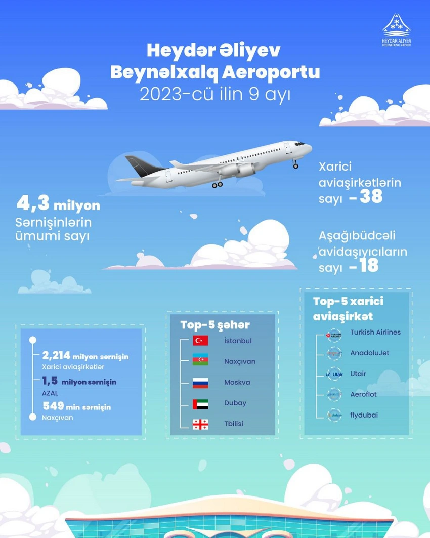 Bu ilin yanvar-sentyabr aylarında Heydər Əliyev Beynəlxalq Aeroportunun sərnişin dövriyyəsi ötən ilin eyni dövrü ilə müqayisədə 25 % artaraq 4 milyon 325 min nəfəri keçib.