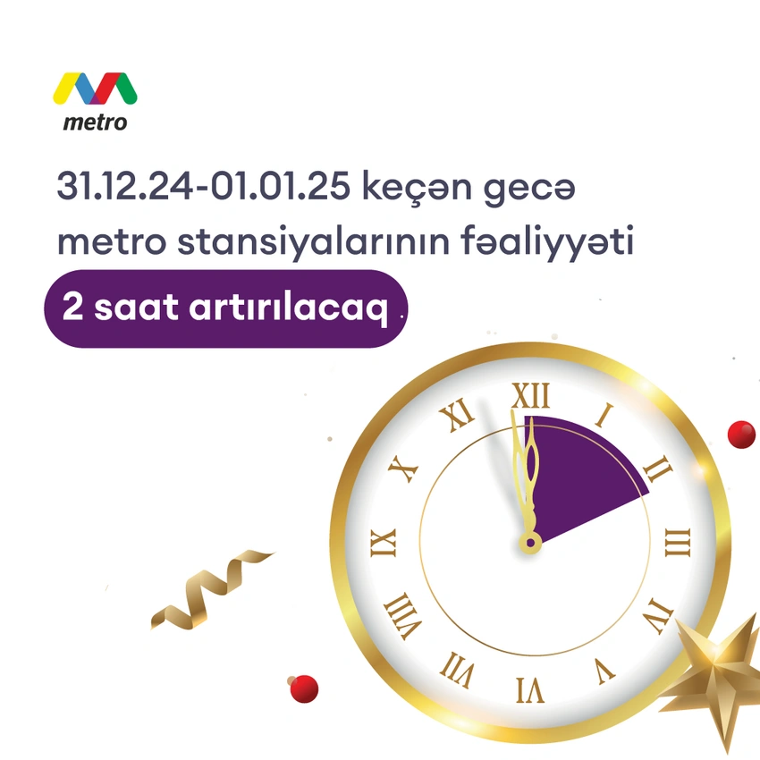 2025-ci il yanvarın 1-nə keçən gecə Bakı metropoliteninin bütün stansiyaları saat 02:00-a qədər sərnişinlərin girişinə açıq olacaq.