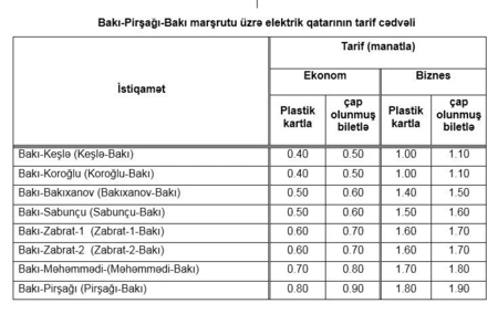 Bu istiqamətdə səhər tezdən 4 qatar, axşam saatlarında isə yenə 4 qatar (ümumilikdə 8 qatar) hərəkət edir. Gediş haqqının məbləği Bakı sərnişin stansiyasından hər 2 Zabrat stansiyasına qədər 0,6-1,7 manat, Məhəmmədi stansiyasına qədər 0,7-1,8 manat, Pirşağı stansiyasına qədər isə 0,8-1,9 manat təşkil edir. Əks istiqamətdə də eyni qiymətlər qüvvədədir. Konkret məbləğ ödənişin plastik kartla və yaxud nağd ödənilməsindən, vaqonun “ekonom” və yaxud “biznes” tipli olmasından asılıdır.