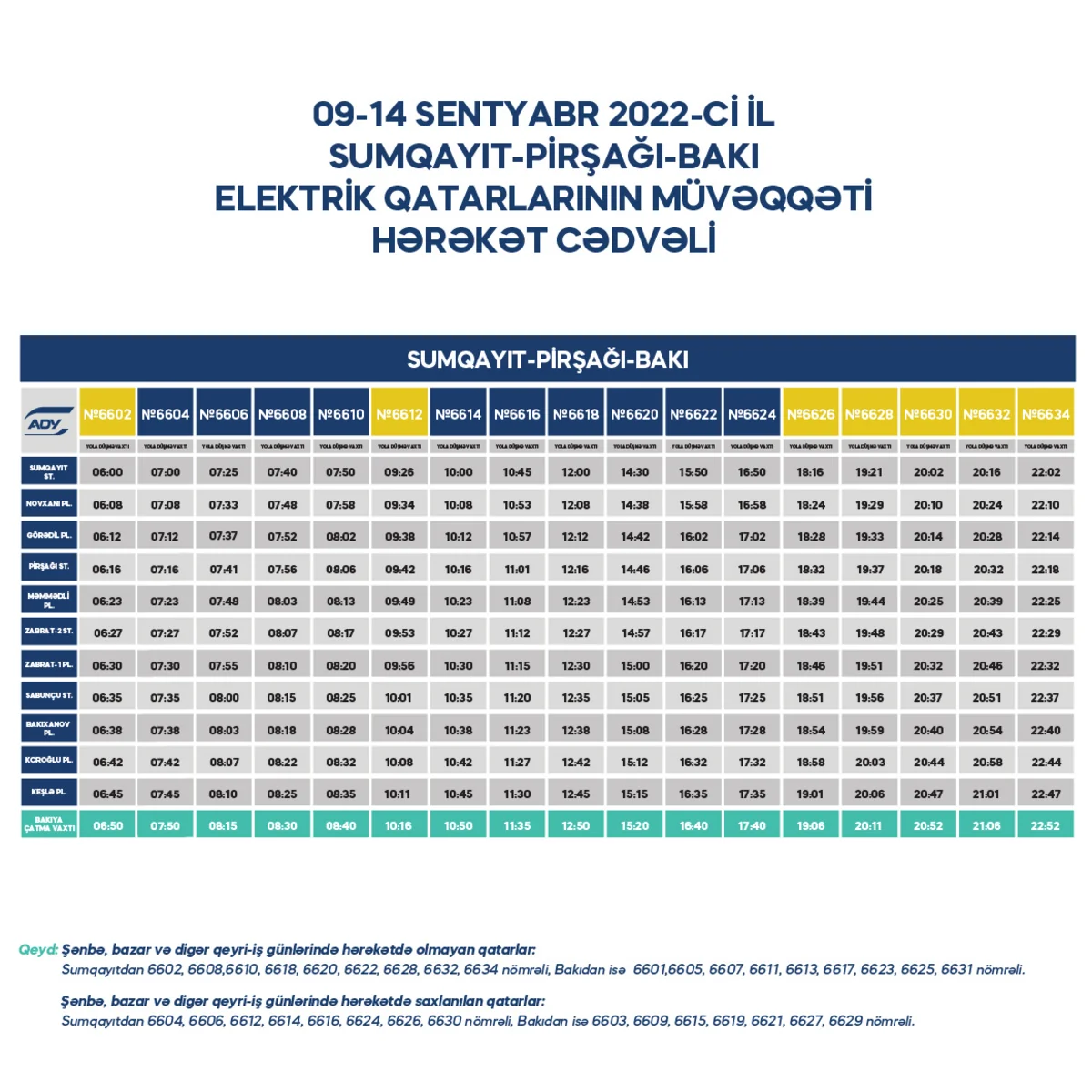 Sabahdan başlayaraq sentyabrın 14-nə qədər Bakı-Pirşağı-Sumqayıt-Bakı, eləcə də Bakı-Xırdalan-Sumqayıt-Bakı şəhərətrafı sürət elektrik qatarlarının hərəkət cədvəlində bəzi reyslərin vaxtında dəyişiklik ediləcək.