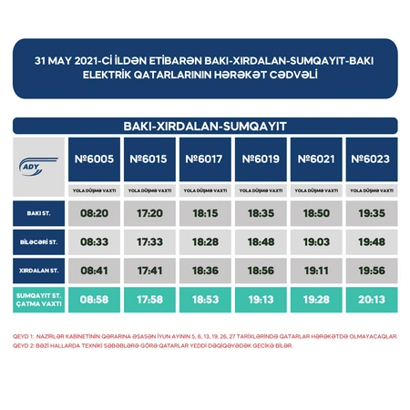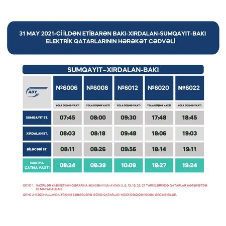 Məlumatda deyilir ki, sərnişinlərin müraciətləri nəzərə alınaraq Bakı-Pirşağı-Sumqayıt istiqamətinə 6605, 6607, 6609, 6611 nömrəli, Sumqayıt-Pirşağı-Bakı istiqamətinə isə 6602, 6614, 6616, 6618 və 6626 nömrəli qatarlar əlavə edilib.