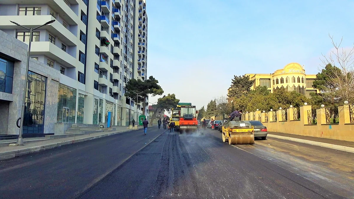 Aparılan təmir işləri çərçivəsində küçə boyu köhnə asfalt-beton örtüyünün üst qatı frezlənərək kənara daşınıb. Hazırda isə frezlənmiş əraziyə əlaqələndirici bitum səpilməklə 2 laydan ibarət yeni asfalt-beton örtüyü döşənir.