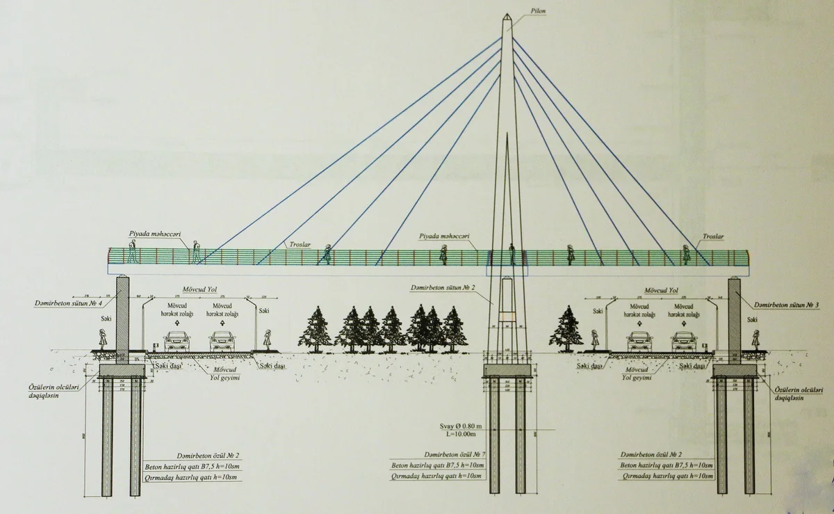 Keçid Moskva prospektini keçməklə avtomobil tuneli üzərində inşa edildiyi üçün orta dayaqsız olacaq. Keçidin tunelin üzərindən keçən və 80 metr uzunluğa malik olan hissəsi hazırda prospektin 20 yanvar küçəsi ilə kəsişmədə inşası aparılan və 30 metr hündürlüyə malik olacaq pilona (dirək) bərkidilmiş xüsusi asqıların (tros) köməkliyi ilə saxlanılacaq.