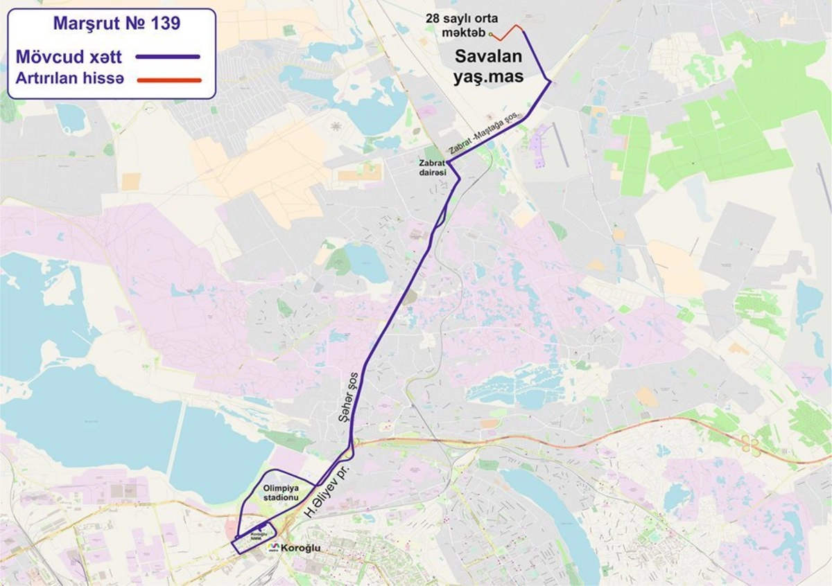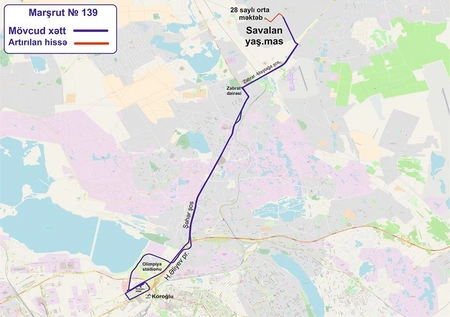 139 nömrəli marşrut xətti üzrə avtobusların hərəkət sxemi uzadılaraq son dayanacaq məntəqəsi Savalan yaşayış massivindəki 28 nömrəli tam orta məktəbin qarşısındakı ərazi müəyyən edilib.