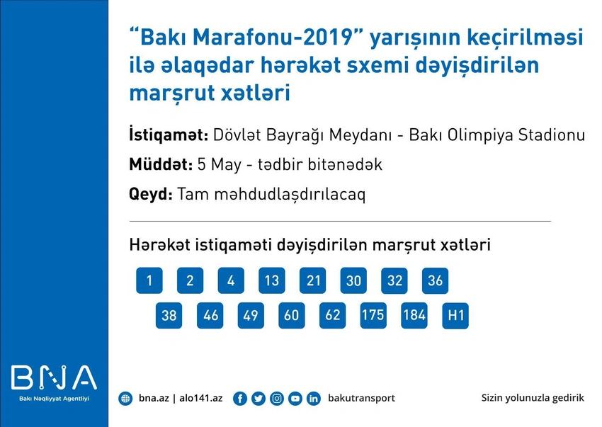 Məlumatda həmçinin deyilir ki, bununla əlaqədar, 1, 2, 4, 13, 21, 30, 32, 36, 38, 46, 49, 60, 62, 175, 184, H1 (Hava Limanı – “28 May” metrostansiyası) nömrəli müntəzəm marşrut xətləri üzrə avtobusların hərəkət istiqaməti müvəqqəti olaraq alternativ küçələrdən təşkil ediləcək.