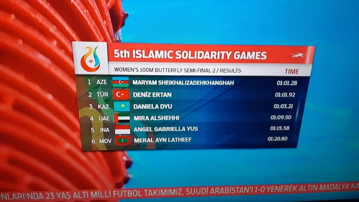 Qadın üzgüçü Məryəm Şeyxəlizadəxangah isə 100 metr məsafədə batterflay üsulu ilə üzmədə yarımfinal mərhələsini 01:01.28 saniyə nəticə ilə birinci pillədə tamamlayıb və finala yüksəlib. O həm də İslamiada rekordu qırıb.