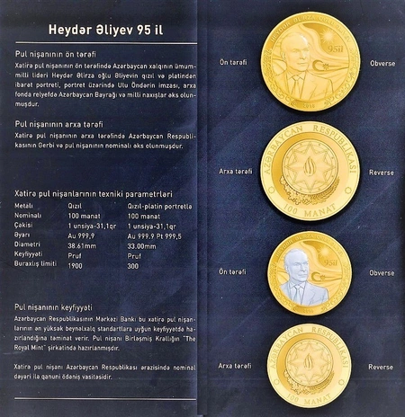 O diqqətə çatdırıb ki, Heydər Əliyevin 95 illik yubileyi ölkə miqyasında layiqincə keçirilməkdədir: "Mərkəzi Bank da ümummilli liderin adının əbədiləşdirilməsini daim diqqətdə saxlayır. Ümummilli liderə həsr olunmuş xatirə pul nişanlarının buraxılması artıq xoş ənənə halını alıb. Ulu öndərin anadan olmasının 80, 85 və 90 illik yubileyləri münasibətilə Mərkəzi Bank tərəfindən müxtəlif qiymətli metallardan hazırlanmış silsilə yubiley pul nişanları tədavülə buraxılıb. Bu pul nişanları ölkə ictimaiyyəti, yerli və xarici numizmatlar tərəfindən yüksək maraqla qarşılanıb. Bu gün də Mərkəzi Bank bir daha qürur hissi ilə Heydər Əliyevin anadan olmasının 95 illiyinə həsr olunmuş xatirə pul nişanının tədavülə buraxılmasını elan edir. Xatirə pul nişanları çəkisi 1 troy unsiyası (31.1 qr) olan yüksək əyarlı qızıldan və platin-qızıl kombinasiyasından ibarətdir. Yubiley pul nişanının üzərində Azərbaycanın dövlət rəmzlərindən, eləcə də memarlıq, şəbəkə sənətində geniş yayılmış ornamentlərdən istifadə olunub. Pul nişanının ön hissəsində xüsusi relyefdə əks olunmuş dövlət bayrağının fonunda ulu öndərin qızıl və platindən hazırlanmış portreti əks etdirilib. Arxa hissəsində isə dövlət gerbi təsvir olunub".