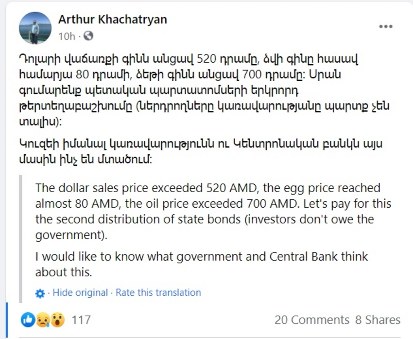 “Ermənistanda ABŞ dollarının məzənnəsi 520 dramı, benzinin qiyməti 700 dramı, yumurtanın qiyməti isə 80 dramı ötüb".