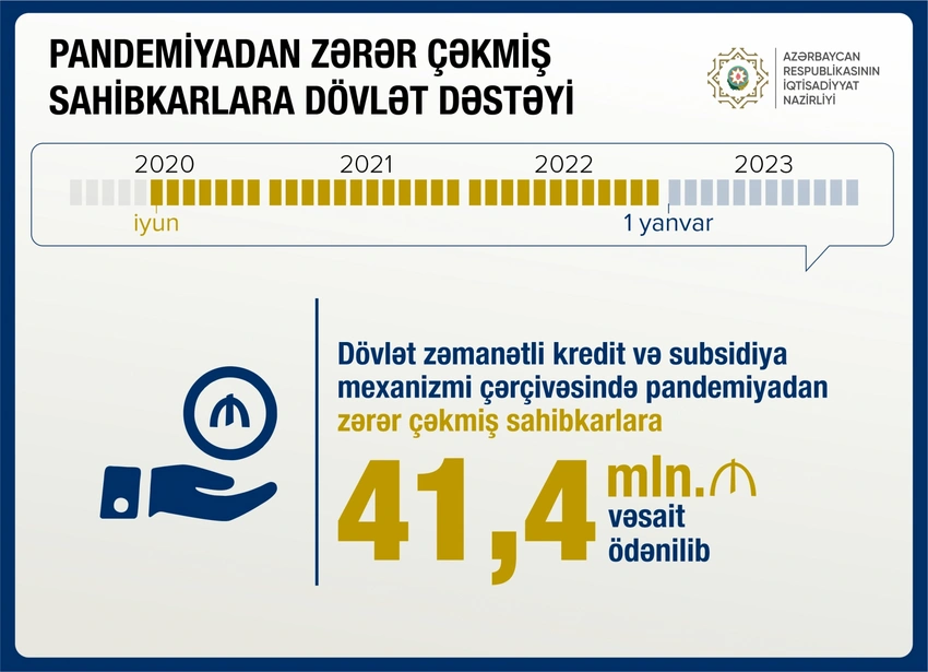 Sahibkarlıq subyektlərinin maliyyə resurslarına çıxış imkanlarının genişləndirilməsi məqsədilə pandemiyadan zərər çəkmiş sahibkarlara 41,4 milyon manat vəsait ödənilib.
