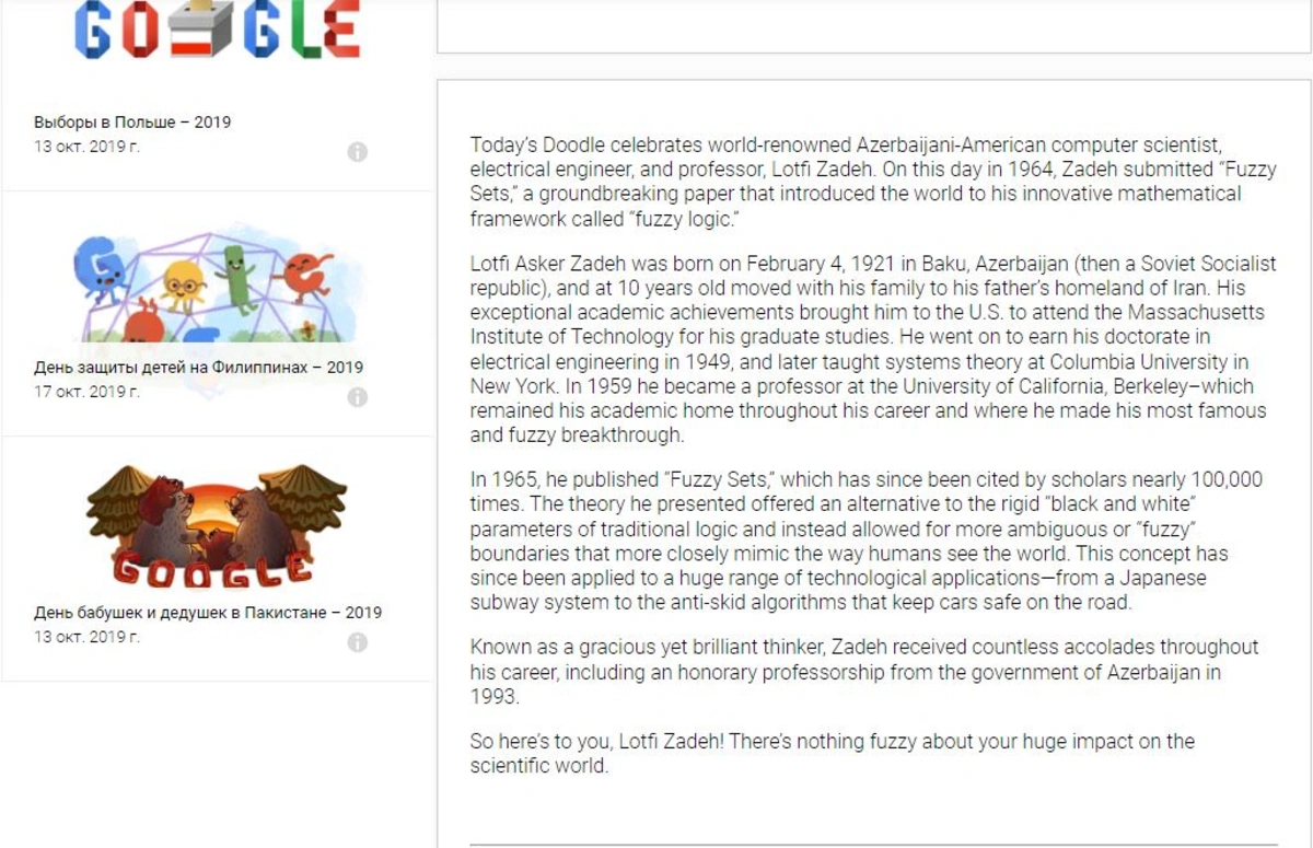 “Google” axtarış saytının əsas səhifəsi dünya şöhrətli azərbaycanlı alim, süni intellekt sahəsində müəssisəsinin ömürlük professoru seçilmiş yeganə şəxs Lütfi Zadəyə həsr edilmiş dudl hazırlayıb.